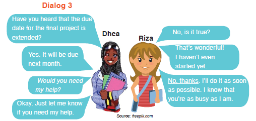 diatas adalah contoh bagaimana ketika kita menawarkan bantuan dan bagaimana responnya, sebenarnya masih banyak lagi ekspresi untuk menawarkan bantuan yang bisa kalian cari juga di sumber lain.