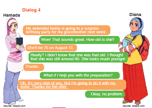 Selamat Siang anak anak, setelah kalian mengerjakan Task 2 yaitu praktek pelafalan kata-kata yang sudah Ibu kirim di grup WhatsApp, selanjutnya silahkan kalian baca baik baik beberapa dialog yang sudah disediakan, dan menjawab pertanyaan yang diberikan