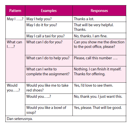 Anak anak kemarin kalian sudah mengerjakan reading dan sudah paham kah kalian pola dari menawarkan jasa? kalian tentu juga memperhatikan ekspresi dalam menawarkan bantuan dan jasa pada dialog kemarin ya, kalian lihat di bawah ini adalah pola untuk menawarkan bantuan dan jasa disertai responnya.